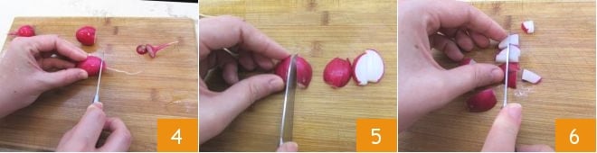 Passez aux radis : retirez les extrémités et les éventuelles feuilles 4 et procédez en les coupant en deux, obtenant des bâtonnets 5 et enfin, coupez les bâtonnets pour obtenir de petits cubes 6.