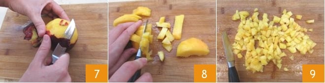 Occupez-vous de la pêche : pelez-la 7, retirez le noyau, coupez-la en petits quartiers et obtenez des gros cubes 8, en les découpant davantage sur la planche jusqu'à obtenir un tartare grossier 9.