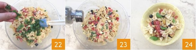 Mélangez et ajoutez le basilic frais, grossièrement émietté à la main 22. Saupoudrez de poivre à votre goût 23, et enfin dressez l'assiette 24.