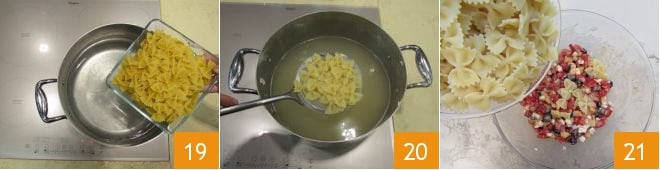 Entre-temps, portez à ébullition une casserole d'eau salée et jetez les farfalles 19. Faites-les cuire très al dente, afin qu'elles ne cuisent pas trop en refroidissant, égouttez-les soigneusement 20 et laissez-les refroidir après les avoir assaisonnées d'un filet d'huile pour qu'elles ne collent pas. Une fois refroidies, ajoutez-les à l'assaisonnement dans le bol 21.