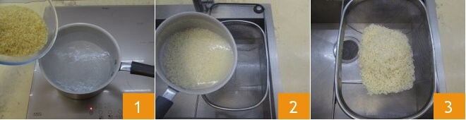 Pour préparer la salade de riz mangue et ananas, commencez par cuire le riz, puis versez-le dans une grande quantité d'eau salée et bouillante et laissez-le cuire selon le temps indiqué sur l'emballage 1. Ensuite, égouttez-le 2 et laissez-le refroidir à température ambiante 3.