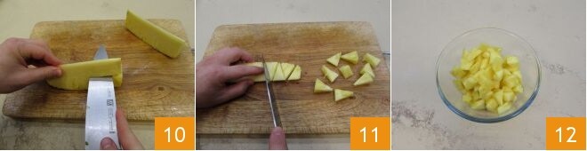 éliminez la partie centrale 10, qui est plus dure, puis disposez les tranches sur la planche à découper de manière à obtenir de petits triangles en coupant transversalement 11 ; versez également les triangles dans un récipient 12.