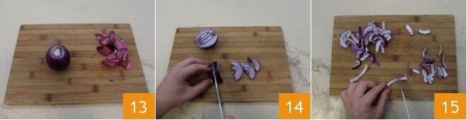 Épluchez l'oignon rouge 13 et coupez-le en tranches d'environ 1 cm d'épaisseur 14, enfin coupez les tranches obtenues en deux ou en trois parties 15.