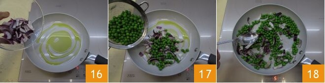 Dans une poêle, versez de l'huile d'olive extra vierge avec les oignons 16 et laissez-les frire un instant, puis ajoutez les petits pois 17 et quelques cuillères à soupe d'eau pour prolonger la cuisson 18, il faudra une dizaine de minutes, juste le temps de les attendrir un peu. La cuisson de l'oignon adoucira le goût, si vous préférez un goût plus prononcé, ne le cuisez pas ; si vous utilisez des petits pois congelés, laissez-les tremper dans de l'eau chaude pendant une dizaine de minutes avant la cuisson.