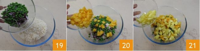 Aussitôt que le riz et les petits pois seront bien froids, mélangez-les 19, ajoutez ensuite les cubes de mangue 20 et les triangles d'ananas 21,