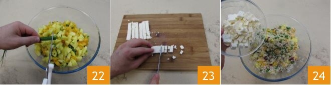 coupez avec les ciseaux un peu de ciboulette 22. Enfin, coupez également la feta en cubes 23 et ajoutez-la à la salade de riz avec une pincée de poivre noir moulu 24.