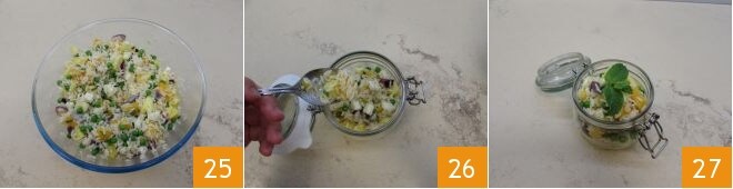 Mélangez bien tous les ingrédients 25 et si vous voulez une façon originale de servir, versez la salade de riz à la cuillère dans des bocaux en verre, vous en obtiendrez 6 en utilisant ceux d'une capacité de 350-400 ml 26 et enfin placez au réfrigérateur en garnissant avec un peu de menthe fraîche pour chaque bocal 27. Après quelques heures au réfrigérateur, votre salade de riz mangue et ananas sera prête à déguster !
