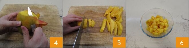Entre-temps, occupez-vous des fruits, épluchez donc la mangue 4, puis coupez-la en lanières et enfin en cubes d'environ 1 centimètre 5, ramassez et réservez dans un récipient 6.