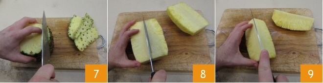 Passez à Comment nettoyer et couper l'ananas: éliminez les deux extrémités de l'ananas puis retirez la peau et les éventuels résidus 7. Coupez-le en deux dans le sens de la longueur pour obtenir deux moitiés 8, et continuez à couper encore en deux, toujours dans le sens de la longueur, jusqu'à obtenir 8 parties au total 9