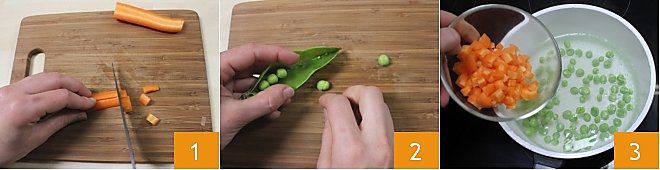 Pour préparer les rouleaux froids de laitue aux légumes, commencez par éplucher une carotte et la couper en petits dés 1. Puis, écossez et lavez les petits pois 2 et faites-les bouillir dans une petite casserole avec les cubes de carotte pendant environ 10 minutes 3 ; si vous utilisez des petits pois déjà écossés, il vous en faudra environ 65 g. Une fois cuits, égouttez-les et conservez-les dans un bol.