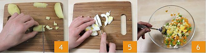 À part, faites bouillir un œuf dans une petite casserole et faites cuire une pomme de terre ; lorsque la pomme de terre est cuite, épluchez-la et coupez-la en cubes 4 et lorsque l'œuf est dur, retirez la coquille et divisez-le en deux en séparant les jaunes que vous pouvez émietter dans le bol ; puis coupez les blancs en morceaux 5 et ajoutez-les, ainsi que les autres ingrédients : la pomme de terre, les petits pois et les carottes 6.