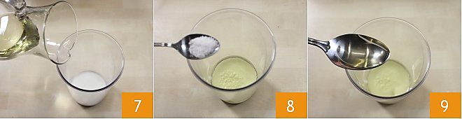 Préparez maintenant la fausse mayonnaise : versez le lait de soja et l'huile de tournesol dans un verre haut, le verre en plastique du mixeur plongeant conviendra parfaitement 7. Ajoutez le sel 8 et 1 cuillère à soupe de vinaigre (ou jus de citron) 9.