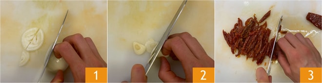 Pour préparer le lapin mijoté avec des olives et des tomates séchées, commencez par bien égoutter les tomates séchées de l'huile et préparez le bouillon de légumes en suivant notre recette. Coupez en fines tranches l'oignon 1 et l'ail 2. Coupez ensuite les tomates séchées en lanières 3.