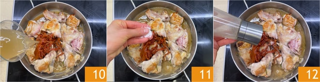 Versez le bouillon dans la casserole 10, salez 11 et poivrez 12.