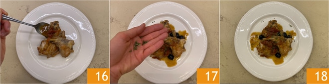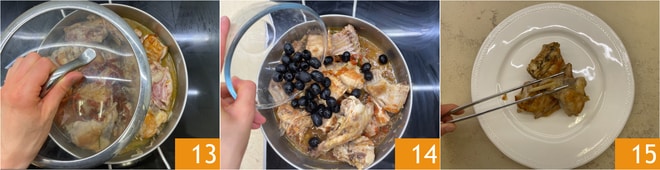 Mélangez, couvrez avec un couvercle 13 et faites cuire à feu doux pendant environ 40 minutes ou jusqu'à ce que le lapin soit tendre. Si nécessaire, vous pouvez ajouter un peu plus de bouillon pendant la cuisson. Dans les 5 dernières minutes de cuisson, ajoutez les olives 14 et mélangez une dernière fois. Dressez sur assiette 15.