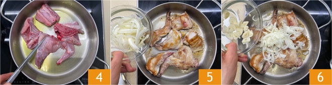 Dans une casserole, chauffez l'huile et ajoutez le lapin 4, faites-le dorer à feu moyen sur tous les côtés jusqu'à obtenir une belle couleur dorée, cela prendra environ 5-10 minutes. Ajoutez ensuite l'oignon 5 et l'ail 6.