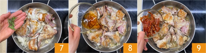 Ajoutez le romarin 7 et déglacez avec le Marsala 8. Mélangez et laissez évaporer toute la partie alcoolique. À ce stade, ajoutez les tomates séchées 9.