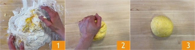 Pour préparer les lasagnes à la Norma, commencez par disposer la farine en fontaine, cassez les œufs au centre et ajoutez une pincée de sel. Avec une fourchette, cassez les œufs et incorporez progressivement la farine, puis continuez à pétrir à la main 1 2, jusqu'à obtenir une pâte lisse et homogène 3. Enveloppez-la dans du film plastique et laissez-la reposer au réfrigérateur pendant 30 minutes.
