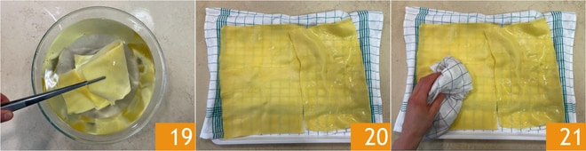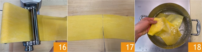 Reprenez la pâte du réfrigérateur et étalez-la à l'aide d'une machine à pâte 16 ou d'un rouleau à pâtisserie, jusqu'à obtenir des feuilles fines, d'une épaisseur de 1-2 mm. Coupez-les à la taille du plat à gratin que vous allez utiliser, ici nous avons utilisé un 30x20 cm 17, plongez-les ensuite dans de l'eau bouillante salée et faites cuire pendant quelques minutes 18.