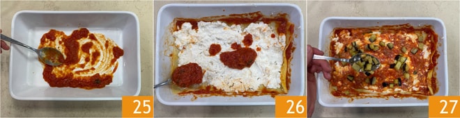 Composez la lasagne en mettant de la sauce au fond du plat à gratin de 30x20 cm 25, ajoutez la pâte et étalez-la avec la crème de ricotta, ajoutez un peu plus de sauce 26, en la répartissant uniformément sur toute la surface, et les aubergines frites 27.