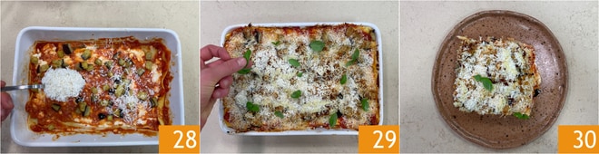 Saupoudrez de ricotta salée 28. Répétez le même procédé jusqu'à épuisement des ingrédients. Faites cuire au four statique à 180°C pendant 20-25 minutes, ou jusqu'à ce que la surface soit croustillante et dorée. Garnissez la surface avec des feuilles de basilic frais 29. Les lasagnes à la Norma sont prêtes à être dégustées 30.