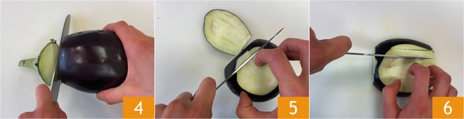 Entre-temps, retirez le pédoncule de l'aubergine 4, puis coupez-la d'abord en tranches 5, puis en bâtonnets 6.