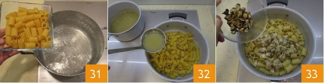 Et ensuite ajoutez les pâtes 31. Faites cuire les pâtes, en ajoutant du bouillon à chaque fois que les pâtes absorbent complètement le précédent 32. Ajoutez, presque en fin de cuisson, les palourdes et les moules décortiquées 33.