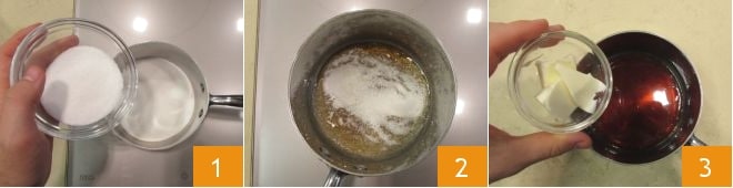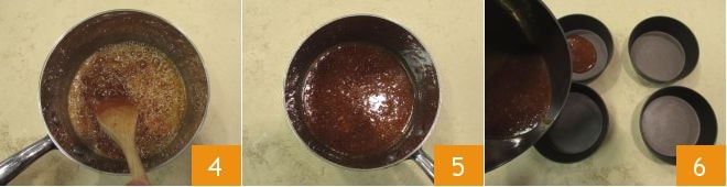 Remuez avec une cuillère en bois 4 pour bien amalgamer le tout 5, puis versez immédiatement le caramel au beurre dans 4 moules de 10 cm de diamètre 6.