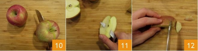 Lavez et séchez les pommes, divisez-les d'abord en deux 10 puis en quartiers. Enlevez le cœur 11 et coupez chaque quart en tranches de 2-3 mm d'épaisseur 12.