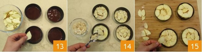 À ce stade, vous pouvez passer à la composition des mini tatin. Reprenez les moules et recouvrez la base de caramel avec une première couche de tranches de pomme 13, puis ajoutez un peu d'amandes grillées 14 et continuez à alterner les couches de pommes et d'amandes jusqu'à épuisement des ingrédients, en terminant par une couche de pommes 15: avec ces doses, vous obtiendrez 4 couches pour chaque moule.