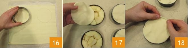Prenez le rouleau de pâte feuilletée et avec un emporte-pièce légèrement plus grand que le moule pour les mini tatins (nous avons utilisé un de 11 cm de diamètre) découpez 4 disques 16. Disposez les disques de pâte feuilletée dans les moules au-dessus de la couche de pommes 17, repliez les bords vers l'intérieur 18