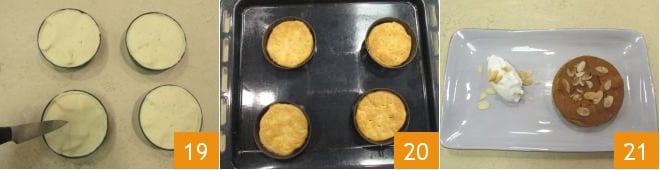 et piquez la surface avec la pointe d'un couteau 19. Transférez les moules sur une plaque de cuisson et faites cuire dans un four statique préchauffé à 180° pendant environ 35 minutes, jusqu'à ce que la pâte soit bien dorée 20. Une fois le temps de cuisson écoulé, sortez les moules du four et laissez tiédir pendant environ 15 minutes, puis inclinez-les légèrement pour faire couler l'excédent de liquide en faisant attention à ne pas vous brûler. Démoulez les mini tatin aux pommes et amandes et servez-les à vos invités, peut-être accompagnées d'une boule de glace à la vanille 21!