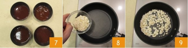Tournez les moules pour répartir le caramel uniformément sur toute la base 7 et mettez-les de côté pour le moment. Prenez maintenant une poêle antiadhésive, ajoutez les amandes effilées 8 et faites-les griller brièvement à feu vif, en veillant à ne pas les brûler: les amandes doivent juste prendre couleur 9.
