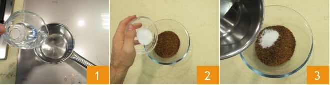 Pour préparer le nougat des morts au café, commencez par la pâte de café. Versez dans une petite casserole 40 g d'eau et portez à ébullition 1. Dans un autre récipient, versez le café soluble et le sucre 2. Dès que l'eau sera bouillante, versez-la dans le bol 3.