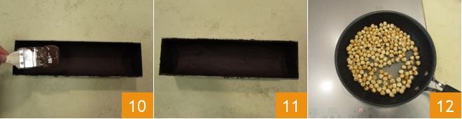 reprenez-le donc et badigeonnez encore avec le reste du chocolat fondu, en répartissant bien avec le pinceau (10-11). Remettez au frais et occupez-vous du reste. Faites griller les noisettes dans une poêle antiadhésive pendant quelques minutes, en remuant souvent pour qu'elles ne brûlent pas ; mettez de côté les noisettes grillées 12.