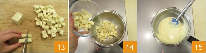Passons maintenant à la crème : émiettez finement le chocolat blanc 13, versez-le dans un bain-marie 14 et laissez fondre en remuant de temps en temps 15.