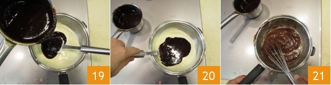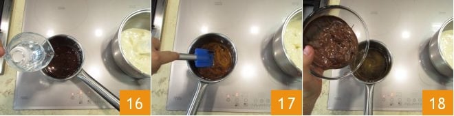 Entre-temps, reprenez la pâte de café, pesez-en 50 g à verser dans une petite casserole. Ajoutez aussi l'eau dans la casserole 16, mélangez et chauffez jusqu'à ébullition 17. Dès que le chocolat blanc est fondu et que la pâte de café est en ébullition, vous pouvez éteindre le feu. Dans la casserole avec le café, ajoutez la crème à tartiner aux noisettes et mélangez 18.
