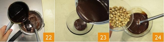 et enfin le dernier tiers 22. Continuez à remuer ; une fois que le mélange est devenu doux et visqueux, transférez-le dans un bol 23 et ajoutez les noisettes grillées précédemment et mélangez 24.