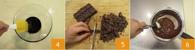 Mélangez bien avec une spatule puis couvrez de film plastique et mettez à refroidir au réfrigérateur pendant une heure 4. Passez à la préparation de la gaine de chocolat pour le moule. Hachez 200 g de chocolat noir 5 et faites-le fondre au bain-marie à feu moyen en remuant de temps en temps 6.