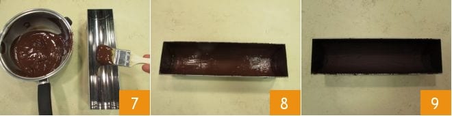 Une fois fondu, badigeonnez l'intérieur du moule avec le chocolat 7 puis mettez au réfrigérateur pendant 10 minutes 8. Au bout de ce temps, il se sera solidifié 9,