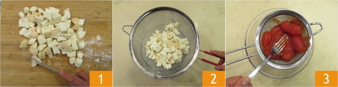Pour préparer les œufs dans le pain, coupez la mozzarella fumée en dés 1. Égouttez-la dans une passoire pour éliminer le petit lait éventuel 2. Transférez les tomates pelées dans un tamis et écrasez-les avec une fourchette pour éliminer le liquide 3.