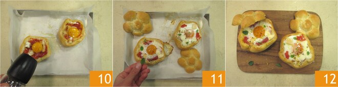 Comment cuisiner les œufs? En plus des méthodes classiques, comme les Œufs durs, voici un plat principal riche et complet prêt en 30 minutes: œufs dans le pain! Nous avons choisi les typiques michette, le pain soufflé traditionnel de Lombardie, qui avec son croûte croustillante, sa mie tendre et son large creux est parfait à garnir! Nous avons choisi d'enrichir les œufs avec de la mozzarella fumée (provola) et de la tomate, le tout cuit au four pour un plat savoureux et original: la mozzarella sera filante et le jaune d'œuf restera bien moelleux! Dans cette recette séduisante, vous découvrirez une nouvelle façon de déguster les œufs en réalisant un sandwich tout simplement délicieux!