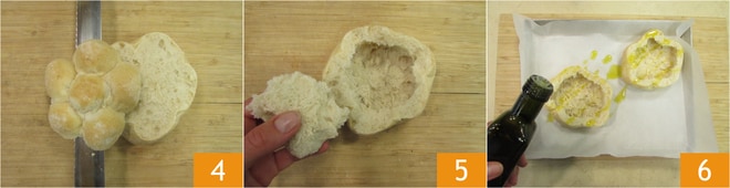 Coupez le haut des michette 4, retirez une grande partie de la mie 5 et déposez-les sur une plaque recouverte de papier sulfurisé. Assaisonnez la base des michette avec un filet d'huile d'olive extra vierge 6 et du sel.