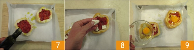 Garnissez avec les tomates pelées 7 et ajoutez un filet d'huile. Passez-les dans un four ventilé préchauffé à 190°, pendant 5 minutes. Sortez-les du four et ajoutez la mozzarella en dés 8, puis versez délicatement l'œuf à l'intérieur 9.