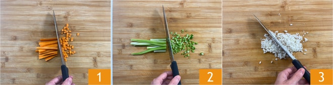 Pour préparer le pain cuit aux haricots, mettez-les à tremper selon les modalités et le temps indiqués sur le paquet, généralement 8-10 heures dans de l'eau froide, avec un rinçage final. Pour le soffritto, coupez l'ail en fines tranches, retirez les graines du piment et coupez-le en fines rondelles. Épluchez et coupez la carotte en dés de 2-3 mm 1 et le céleri 2, effeuillez et hachez finement l'oignon 3.