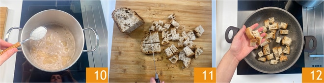Assaisonnez avec une belle pincée de sel, mélangez et réservez au chaud 10. Puis prenez le pain et coupez-le en cubes d'environ 2-2,5 cm 11 et placez-le dans une casserole plus large et basse 12.