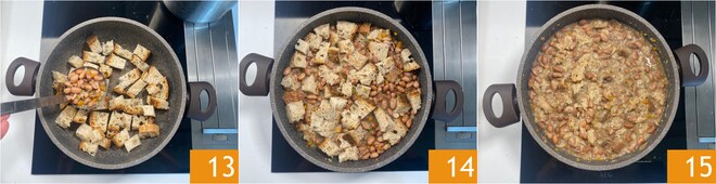 Ajoutez la "soupe" de haricots jusqu'à recouvrir le pain 13 14, si nécessaire, vous pouvez ajouter de l'eau supplémentaire. Faites cuire encore 15 minutes, en remuant de temps en temps, pour bien émietter et ramollir le pain 15.