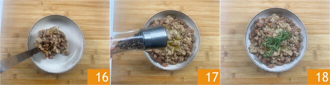 Laissez le pain cuit aux haricots légèrement liquide car il aura tendance à s'épaissir rapidement. Dressez dans une assiette 16 en ajoutant un filet d'huile crue, du poivre 17 et des herbes aromatiques à votre goût 18 !