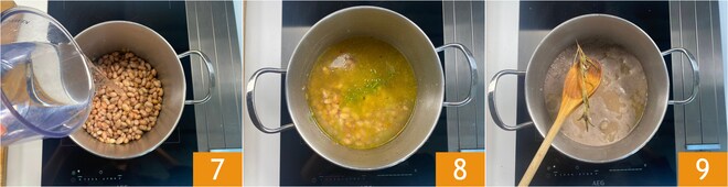 Couvrez avec de l'eau (environ 1,5 l) 7 8, vous en ajouterez le reste si nécessaire. Attendez la première ébullition, puis faites cuire environ 1 h et 30 minutes avec le couvercle : cela dépendra également de la variété de haricots utilisée, à la fin, ils doivent être tendres mais consistants. Vous pouvez ensuite retirer le romarin 9.