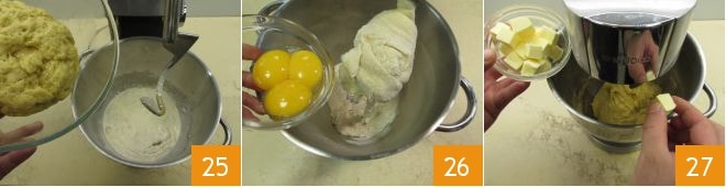 puis la pâte levée 25 et activez le robot pendant 2 minutes à vitesse moyenne. Avec le crochet toujours en fonction, ajoutez les jaunes d'œufs et continuez à travailler jusqu'à ce qu'ils soient complètement incorporés 26. Enfin, ajoutez le beurre petit à petit 27, toujours à température ambiante